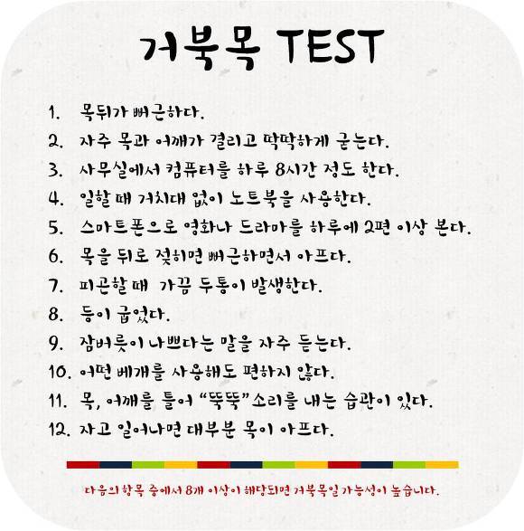 스스로 거북목인지 체크해 볼 수 있는 테스트 카드를 만들어 보았습니다! 한 번 꼭 체크해보고 가세요! 위의 test 이미지에서 8가지 이상의 질문에 체크하셨다면, 혹시 자신의 목이 앞으로 빠져나와서 굳어 있는 바로 그 상태가 아닌지 점검해야 합니다. 구부렸던 등과 가슴을 쫙 펴고 시선을 위로 보면서 경직되었던 등과 허리, 목을 스트레칭해주세요!
